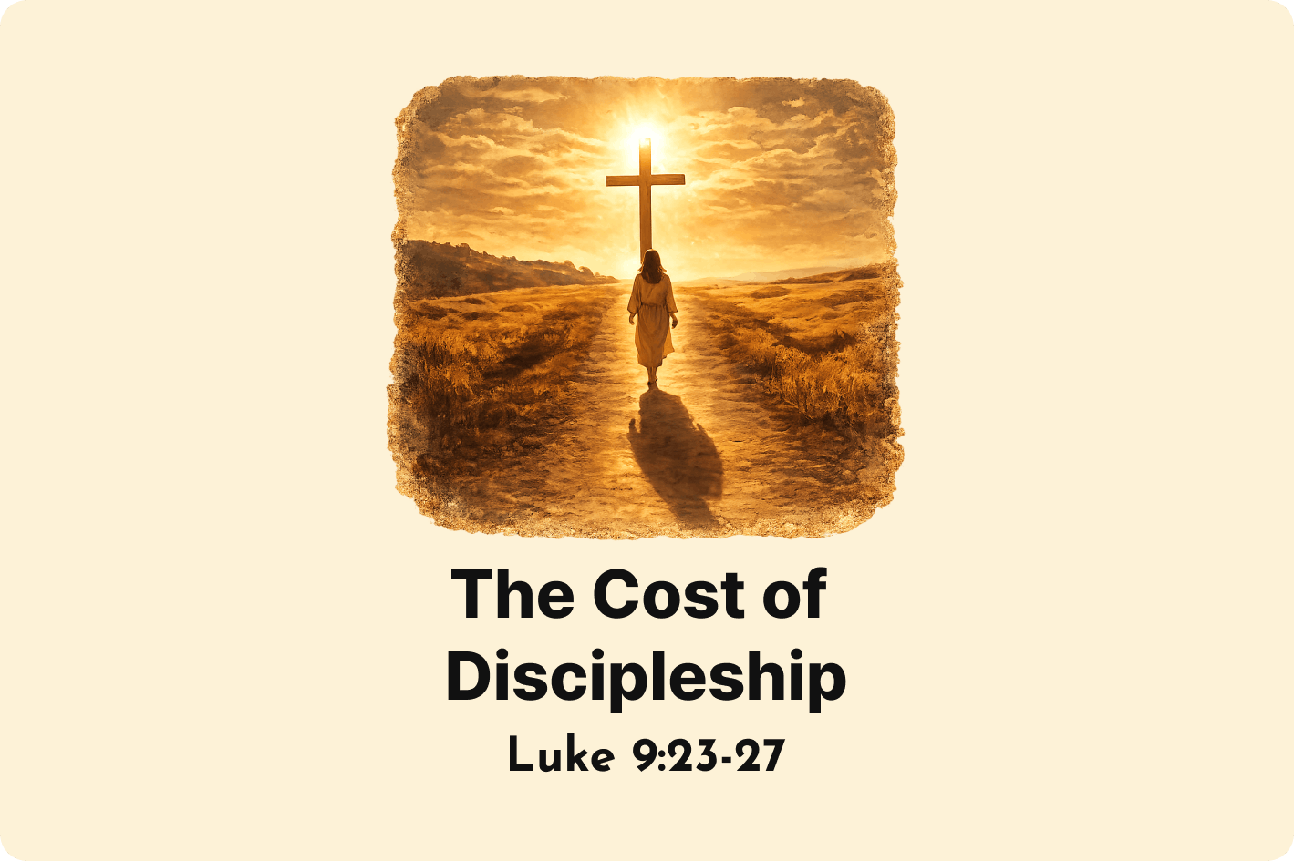 Our theme today is “The Cost of Discipleship.” In Luke 9, Jesus has just spoken about His own coming suffering and glory, and now He turns to the crowd to explain what it means to follow Him.